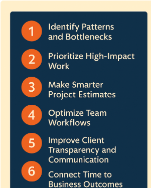 Historical time data gives agencies evidence-based insights into task duration. This allows for realistic estimates, better resource allocation, and fewer last-minute crunches, protecting both your team and your client relationships.