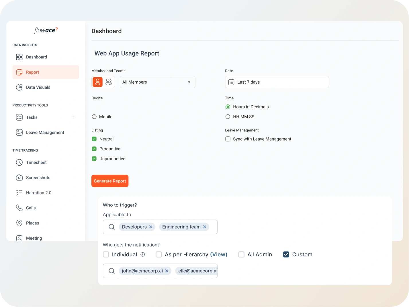 Absolutely. Flowace integrates with major HR, payroll, and calendar systems.