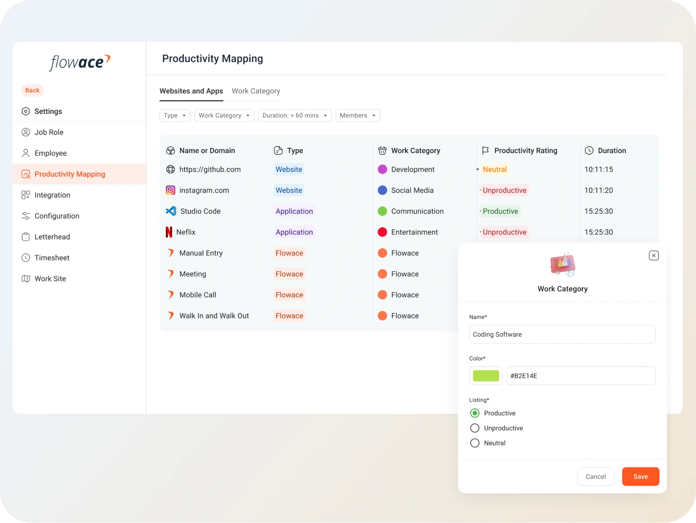 Flowace tracks productivity without keylogging — focusing on tasks and work patterns only.