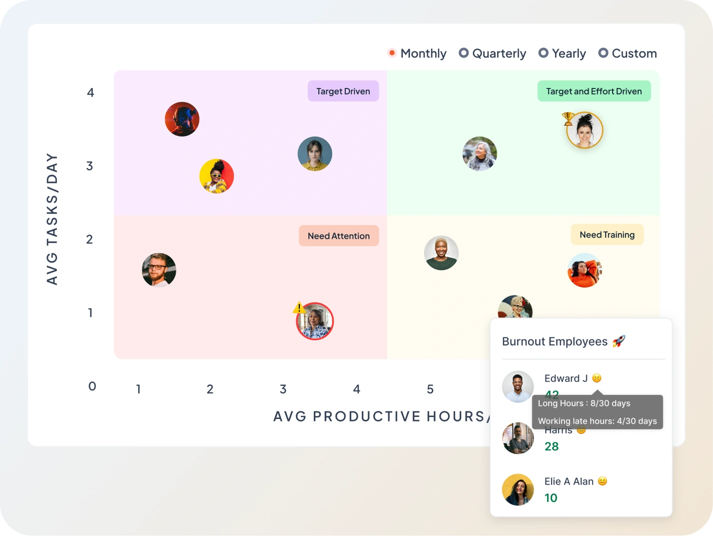 Tasks completed, app & website usage, attendance, project timelines, and custom KPIs.